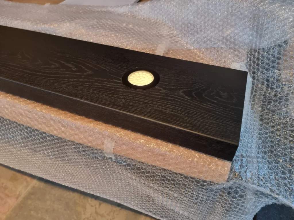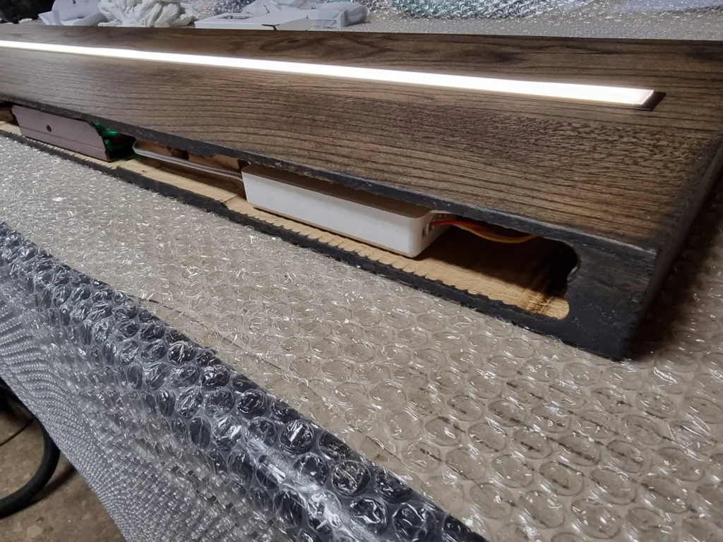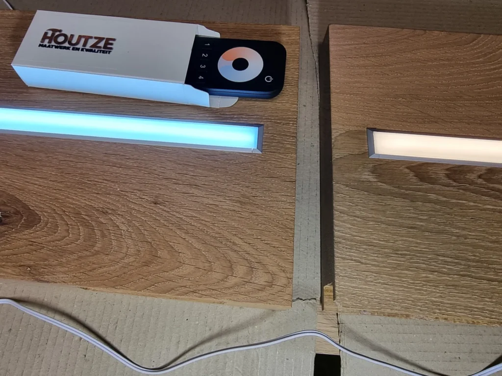 De LED-strip, trafo en ontvanger worden achterin de plank gefreesd. De stroomuitgang én de locatie van de verlichting zijn volledig aanpasbaar op jouw wensen.
