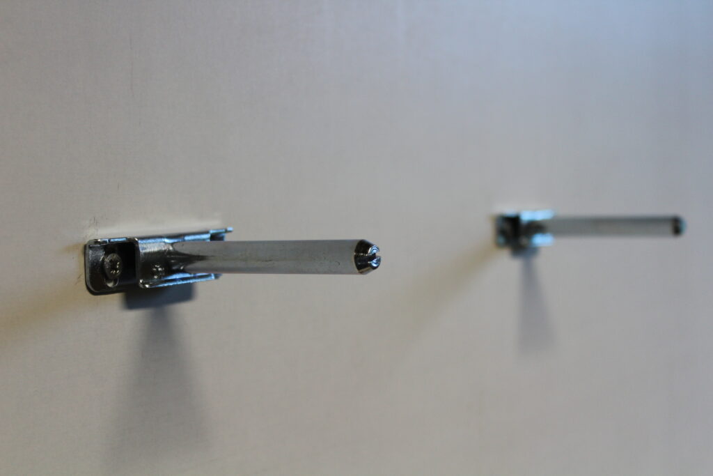 Bevestig de beugels stevig in de pluggen met een schroevendraaier of kruisbitje. Pas de stelschroeven aan indien de beugels niet haaks op de muur staan.
